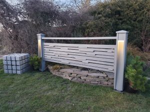 Декоративный забор со столбами-фонарями подсветки дорожек.