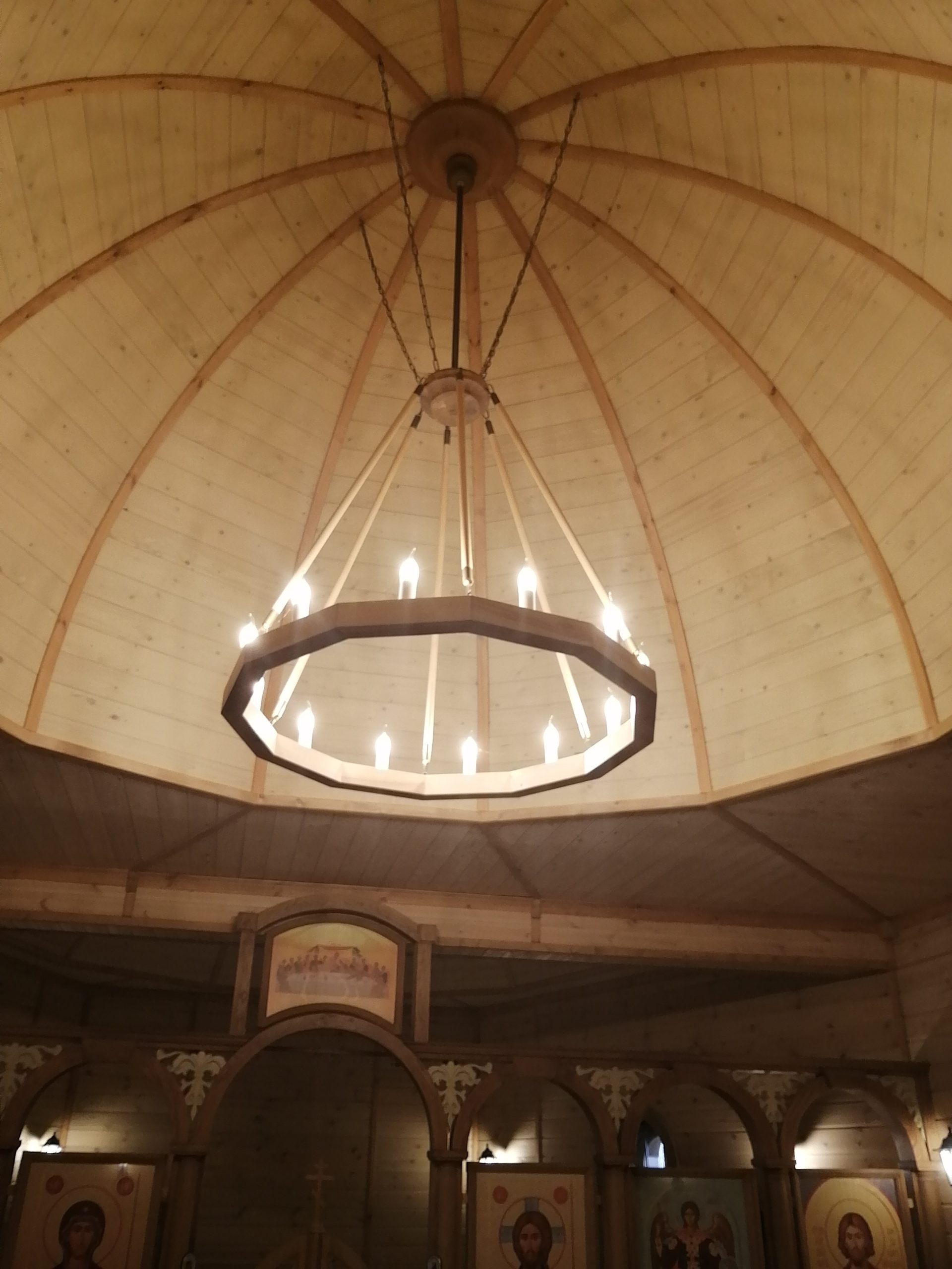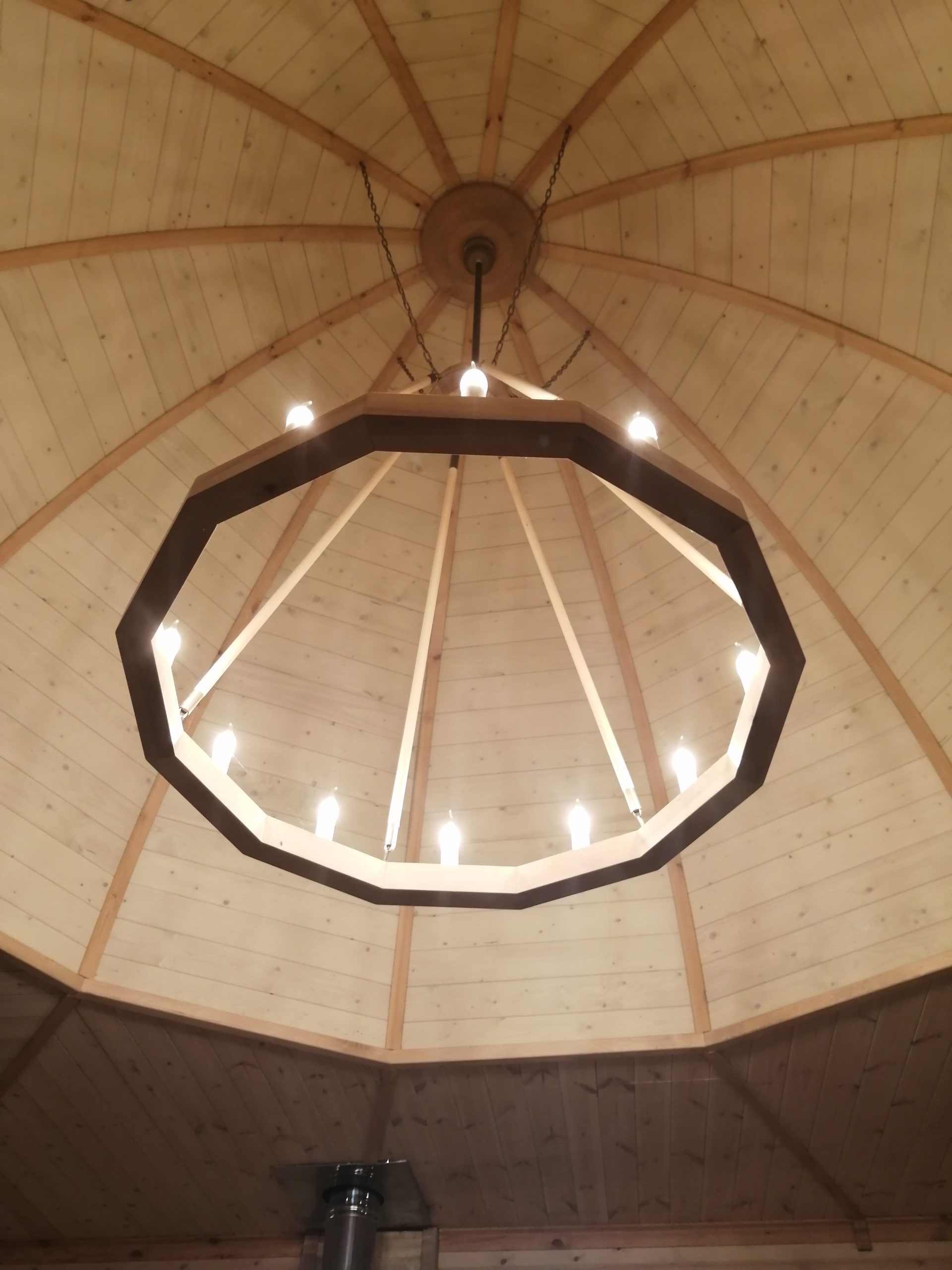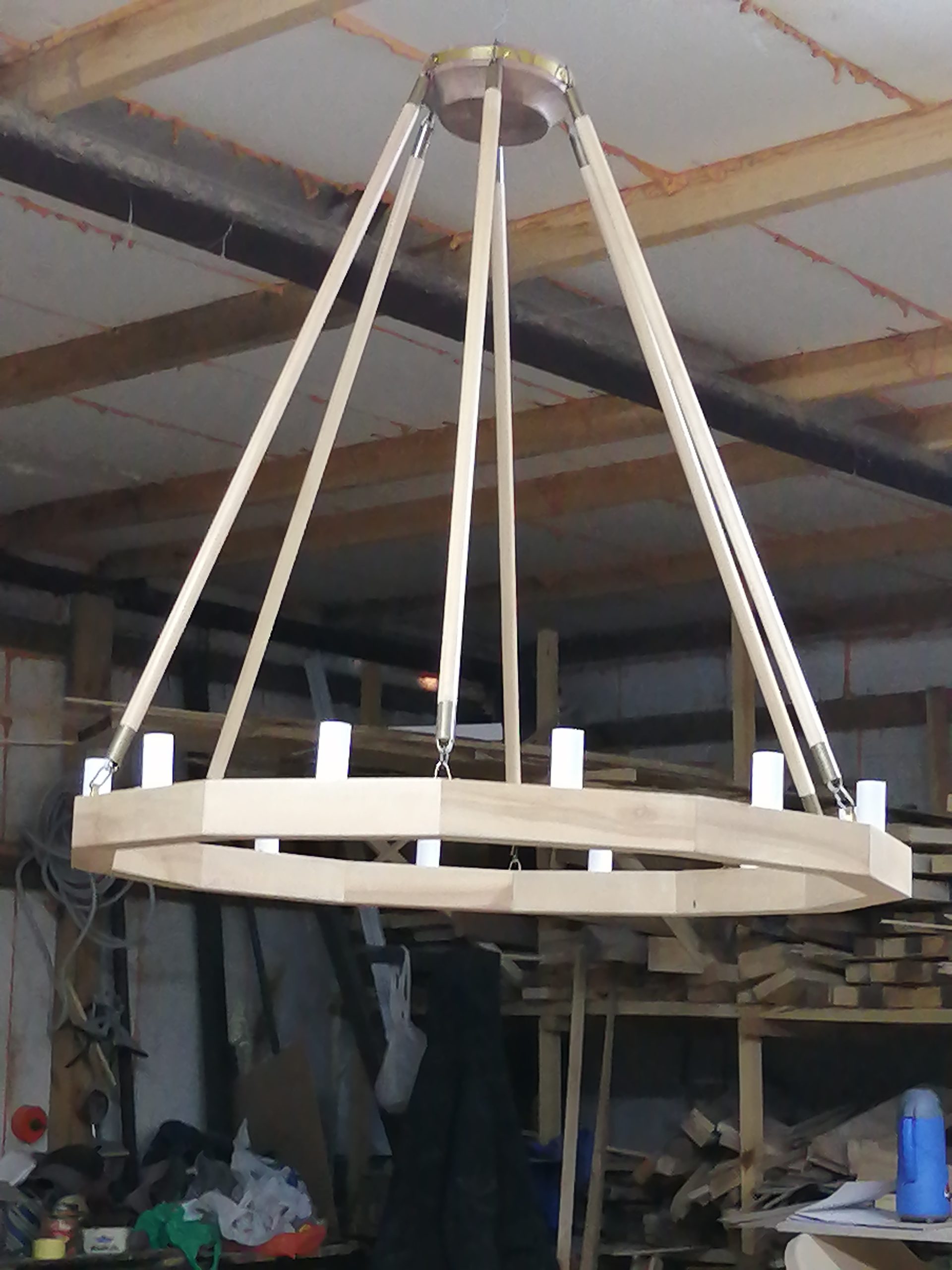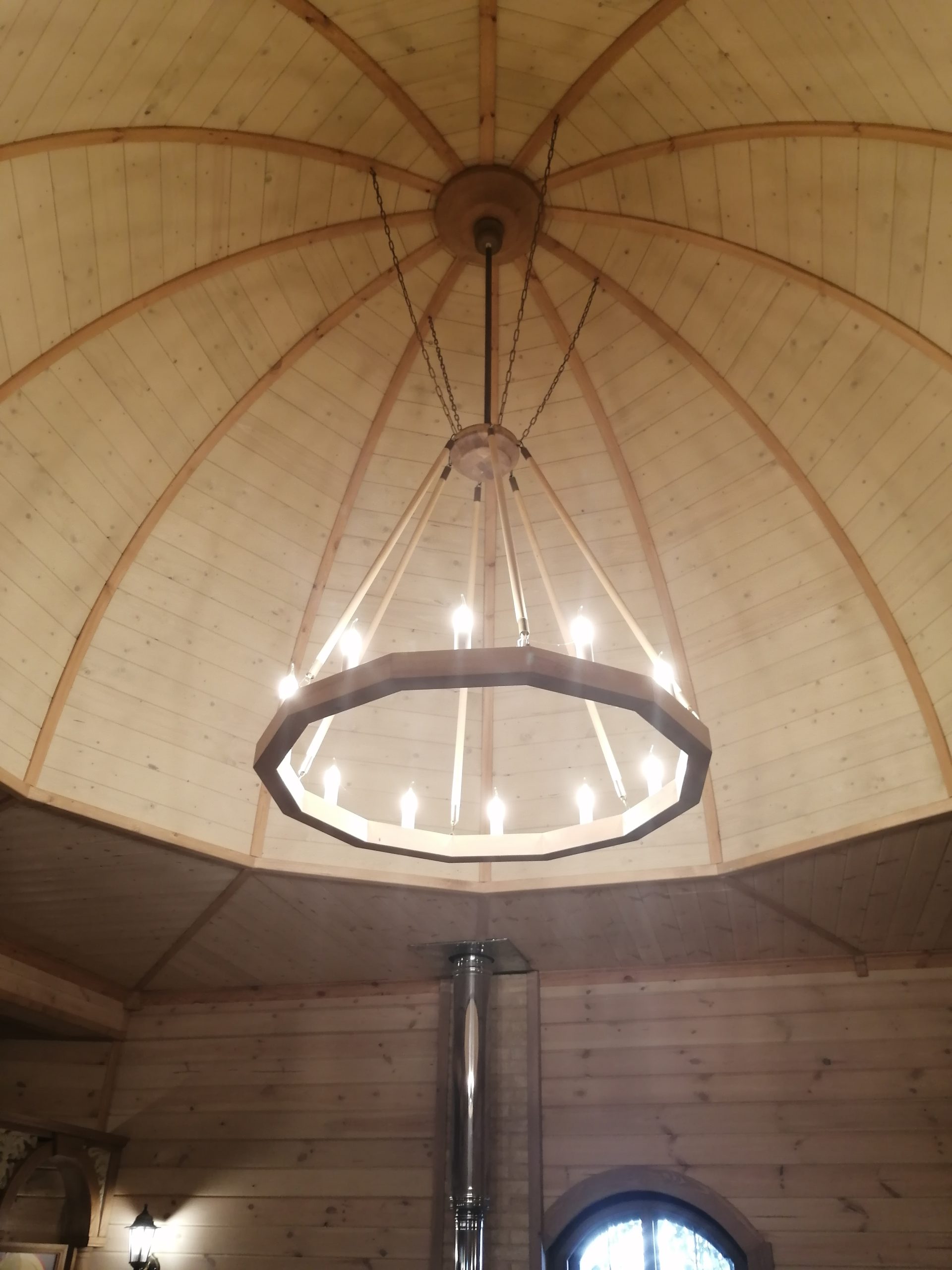 Люстра изготовлена из дерева. Диаметр люстры 1,5 метра.