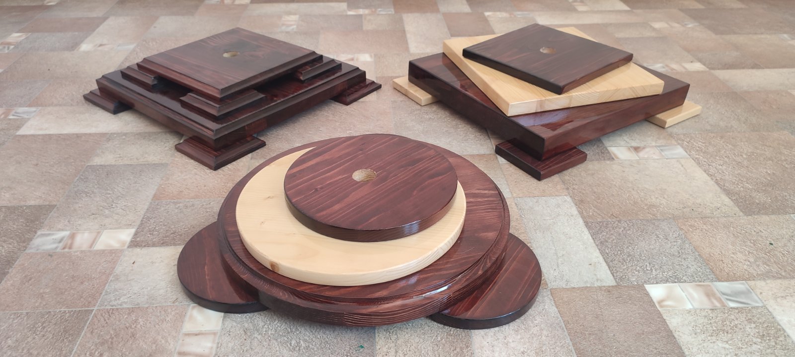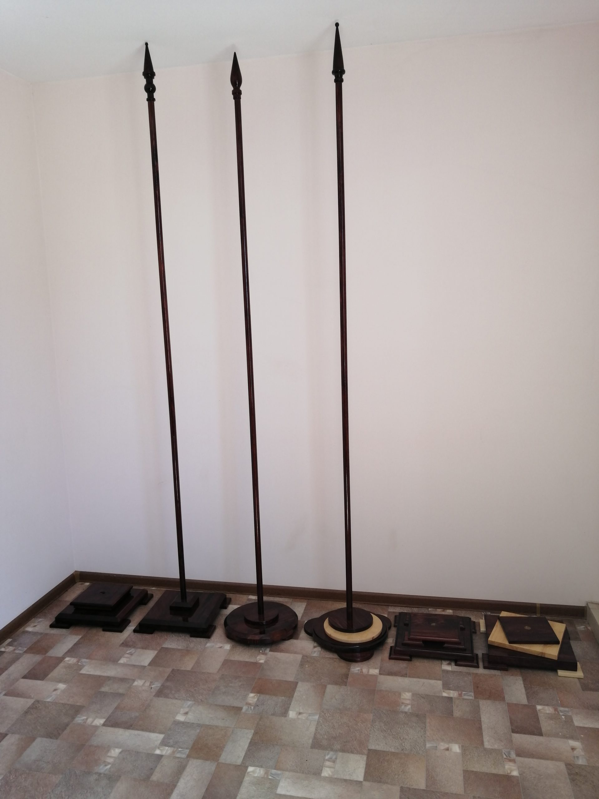 Флагштоки изготовлены из массива сосны. Древко диаметром 28 миллиметров, длина 240 см. Диаметр основания 360 мм., высота флагштока 265 см. Данные флагштоки стоят по 350 рублей. Возможно изготовить флагшток из любой древесины. Гибкая система скидок.